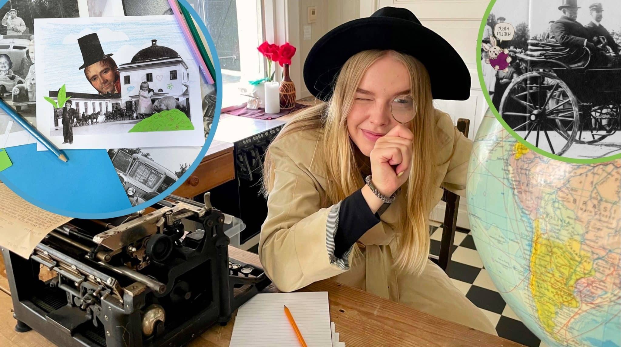 Etter at mysteriet er løst kan du bli med tilbake til VEV, hvor barna kan lage sine egne fotokollasjer med kopier av bilder fra Telemark Museum sin store fotosamling! Her kan man gjerne ta med egne bilder også, hvis man vil.